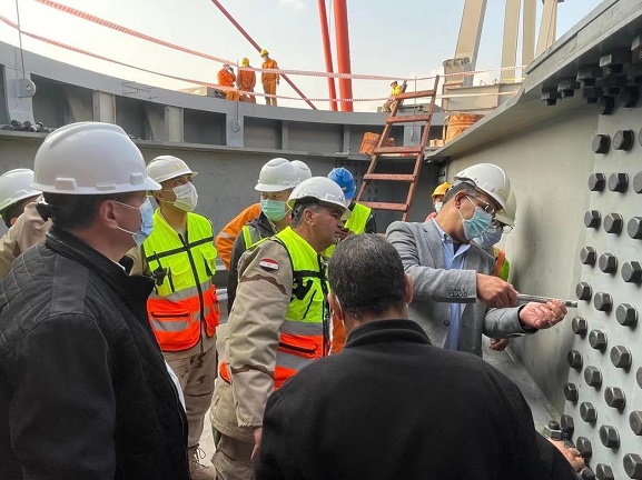 项目新桥桥梁转体装置试转当天,项目业主(GOE-埃及国防部工程局)主管将军携监理公司代表、第三方检测公司代表莅临现场,比对图形、查验数据,对新桥桥梁转体装置安装情况进行验收,并为随后进一步的精准调试收集了相关数据。业主对项目部按期完成新桥桥梁转体装置安装并试转成功表示了充分肯定,并对中国高水平的设备制造和安装水平给予了高度赞扬。