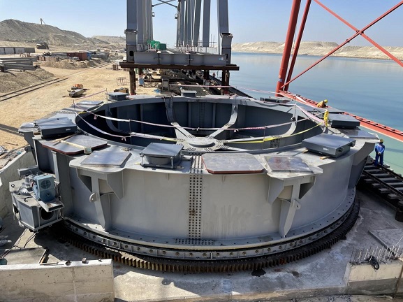 苏伊士运河EL-FERDAN大桥项目最重要的内容之一是在新苏伊士运河上新建一座目前世界上跨度最大的双翼平旋双线铁路桥。桥梁转体装置是新桥建设的核心部件,也是确保苏伊士运河每天顺利通航和火车运行于亚、非大陆的关键所在。该装置直径达18.5米,重达700余吨,是目前世界上用于回转桥体直径最大的回转机构,其结构复杂,加工精度要求高,加工难度大,可靠性要求高。面对这一难题,公司高度重视,项目团队精心组织,从转体装置的设计到制造,对国内外设计公司及重型装备行业供应商展开了全方位调研、考察,在核电、水电、造船、大型冶金装备行业制造技术中寻找解决问题的突破口,通过反复比较与论证,最终确定按照欧标及埃及标准进行设计并用国标进行复核,由国内顶尖大型装备制造商进行制造。转体装置运输到达项目现场后,项目安装团队夜以继日,连续奋战,仅用53天就顺利完成了桥梁转体装置现场装配,并实现成功试转。