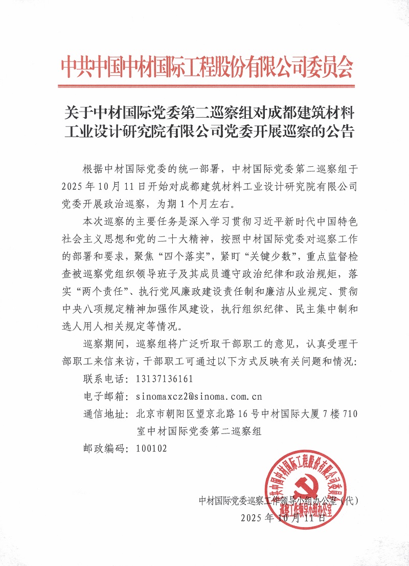 关于中材国际党委第二巡察组对成都建筑材料工业设计研究院有限公司党委开展巡察的公告