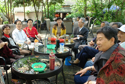 三圣花乡风景秀丽,树木郁葱,花香扑鼻。远离了城市的拥挤与喧嚣,老同志们置身于幽静的花香农居,呼吸着新鲜的空气,感受着田园风光与新农村翻天覆地的变化,人人显得格外舒畅与愉悦。大家相互问寒问暖、我扶你搀,或照照相,或拉拉家常,或玩玩棋.牌。午餐时分,老同志们欢聚一堂,畅叙友谊,抒发感慨。