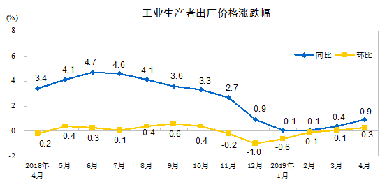 2019年4月份工业生产者出厂价格同比上涨0.9%