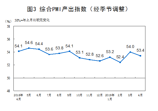 2019年4月份,综合PMI产出指数为53.4%,比上月回落0.6个百分点,表明我国企业生产经营活动总体继续扩张,但步伐有所放缓。