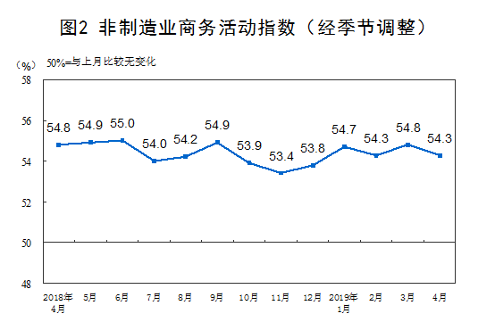 2019年4月份,中国非制造业商务活动指数为54.3%,比上月回落0.5个百分点,但仍位于较高扩张区间,表明非制造业总体保持较快增长态势。