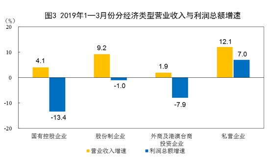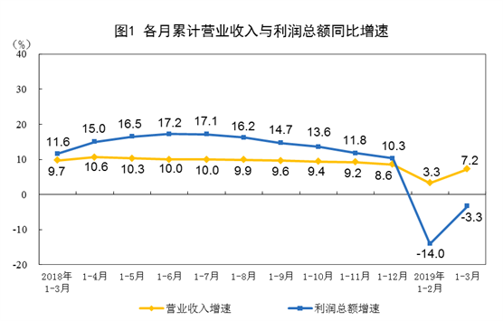 2019年1—3月份全国规模以上工业企业利润下降3.3%,其中3月份增长13.9%